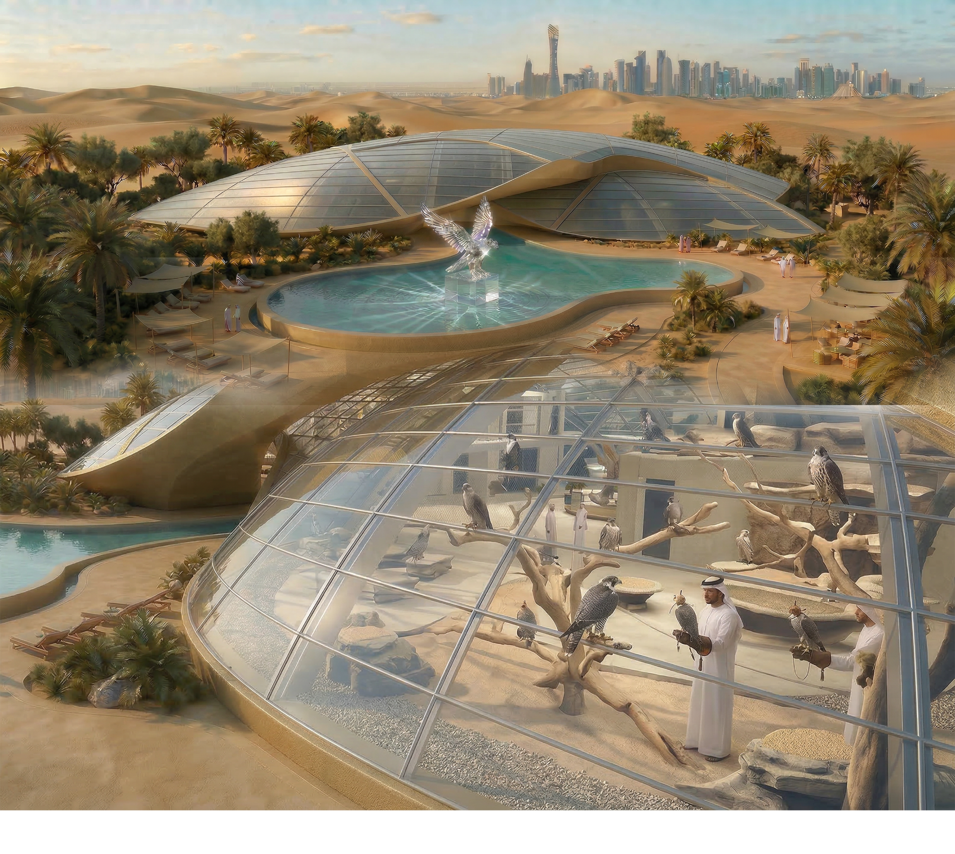 Le Temple du Faucon, 12 200 m² dédiés au faucon.Situé à quelques kilomètres de Doha, à l'entrée du désert, cet havre de paix servira tester les capacités des faucons, les élever et les vendre.